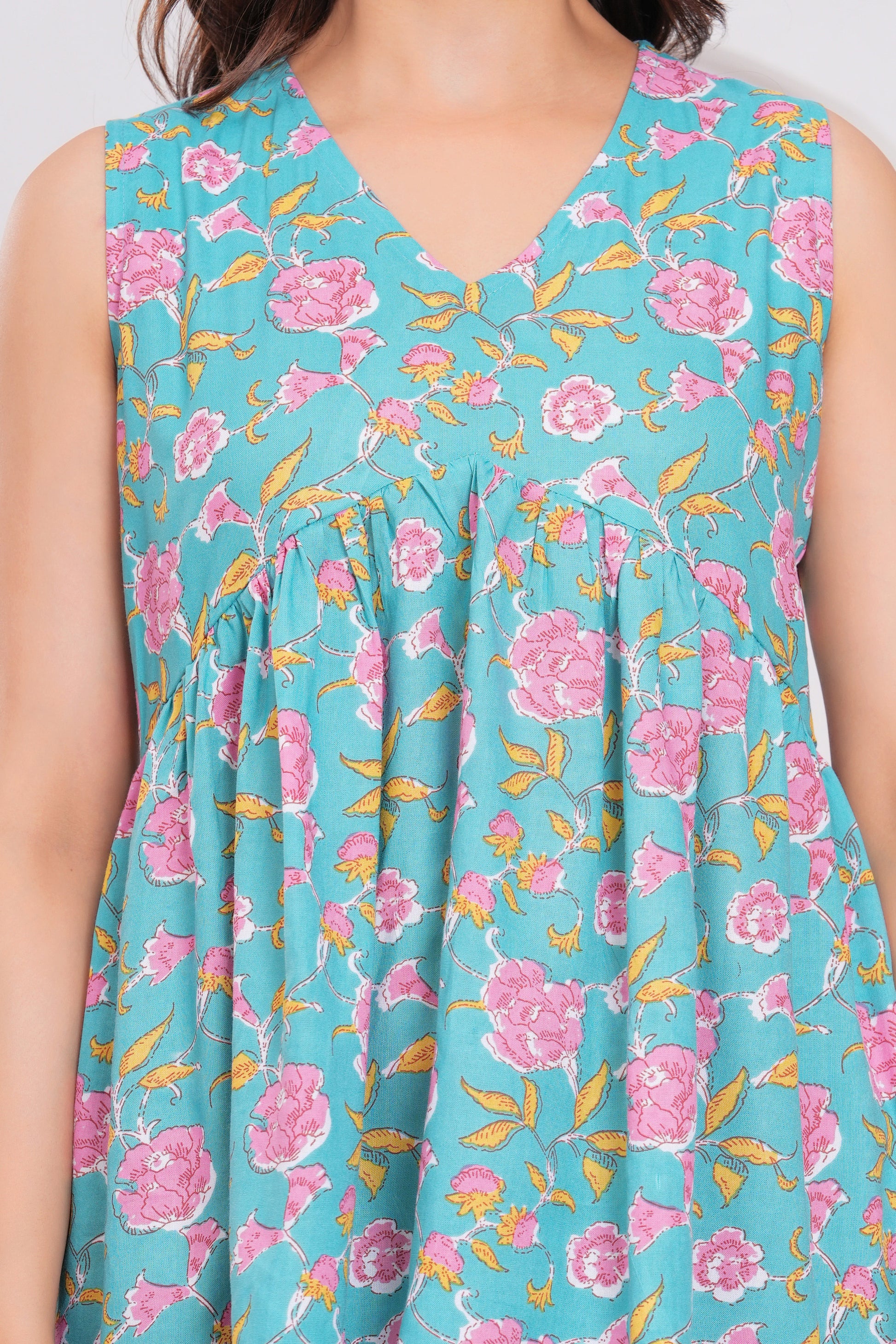 Brighten up your day with the playful elegance of the Blush Garden Sleeveless Kurti. Featuring a soft V-neckline, delicate pleats under the bust, and a gently flared hem, this kurti blends comfort with a feminine silhouette. The floral print in vibrant tones adds a pop of freshness, making it your go-to for brunches, errands, or casual catch-ups. Pair it with jeans or palazzos for an easy yet eye-catching look that feels as light as a summer breeze.