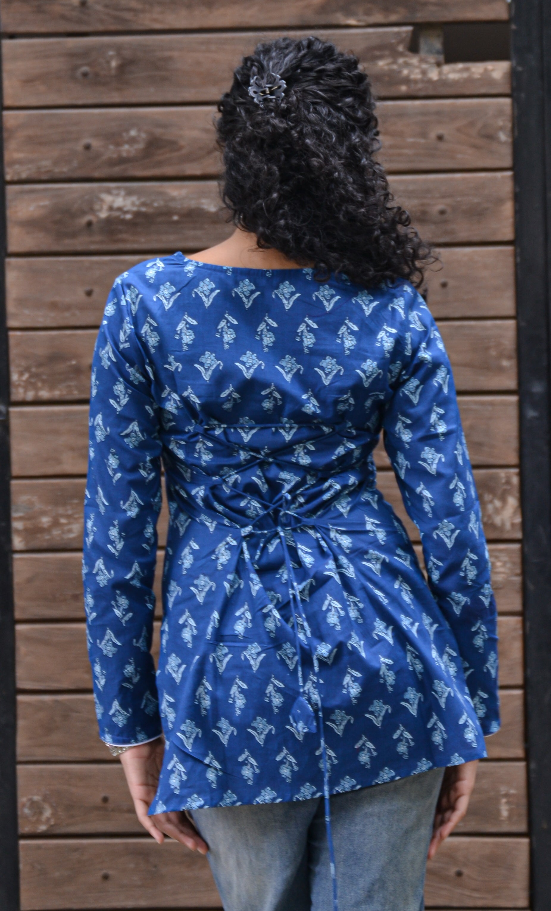 The Sanwari Kurti offers a vibrant splash of indigo blue, featuring a subtle yet striking traditional block-inspired print. Its shorter length and full sleeves make it an incredibly versatile tunic, perfect for pairing with jeans or leggings for a chic, casual look.