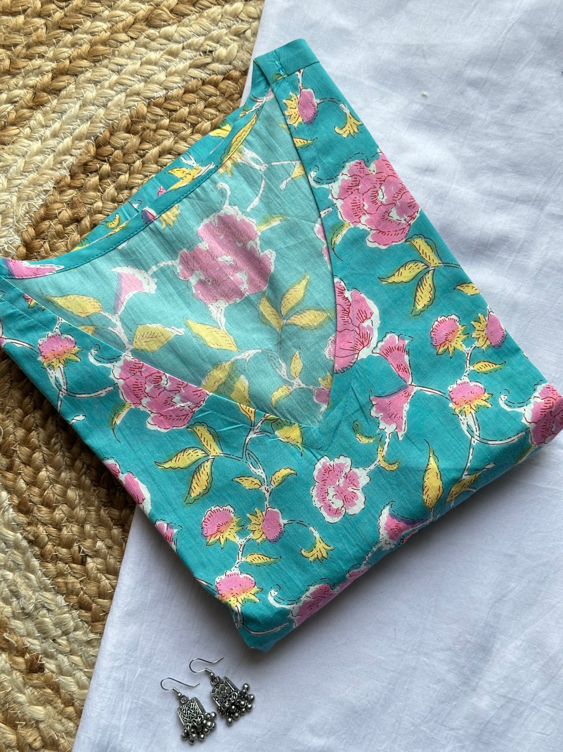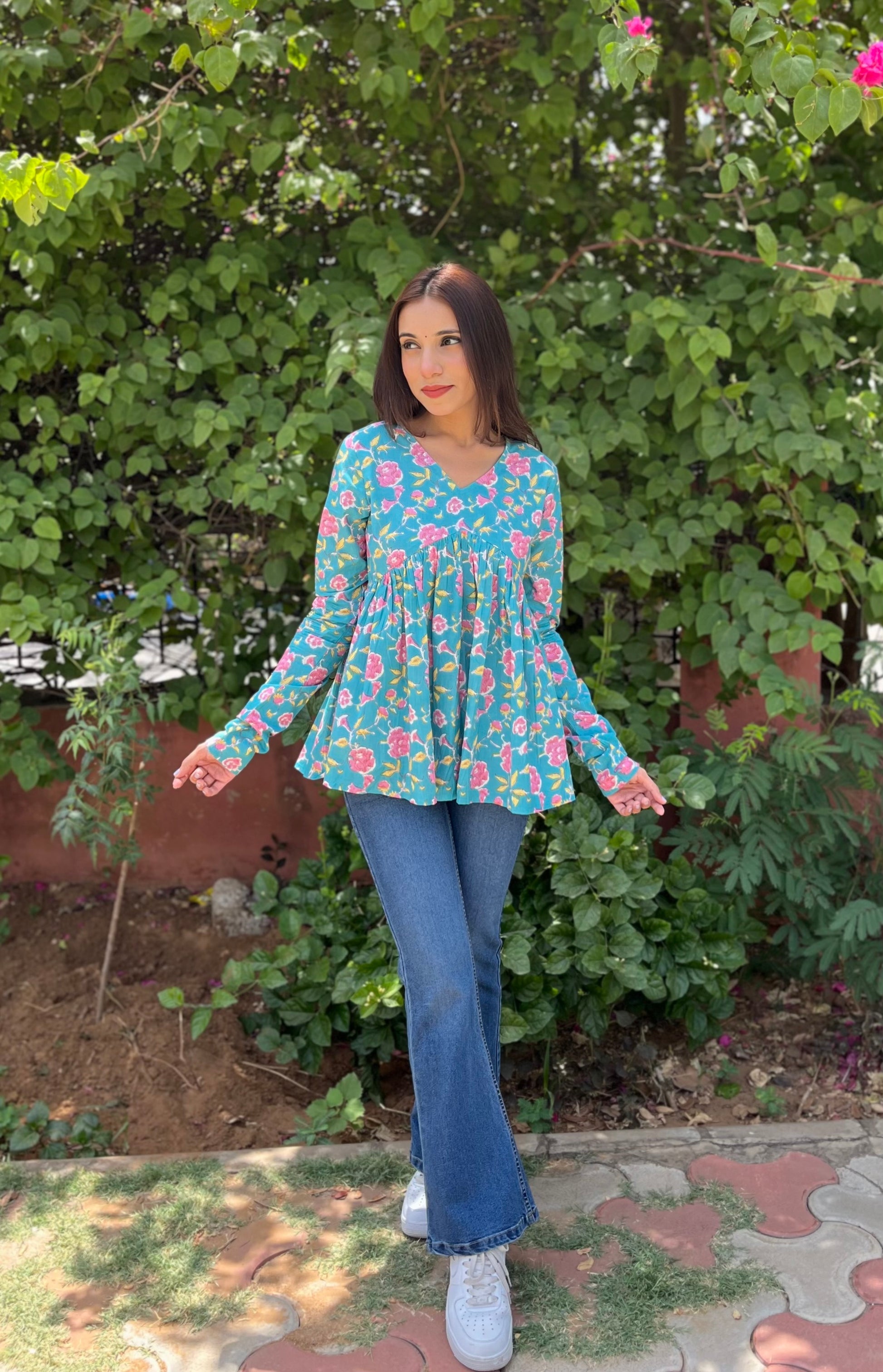 A charming kurti adorned with intricate pink floral patterns and soft yellow leaf accents. Designed with a V-neckline, long sleeves, and a relaxed gathered waist, it blends style and comfort effortlessly. Perfect for casual outings or daytime occasions, it pairs seamlessly with leggings or jeans for a refined look.