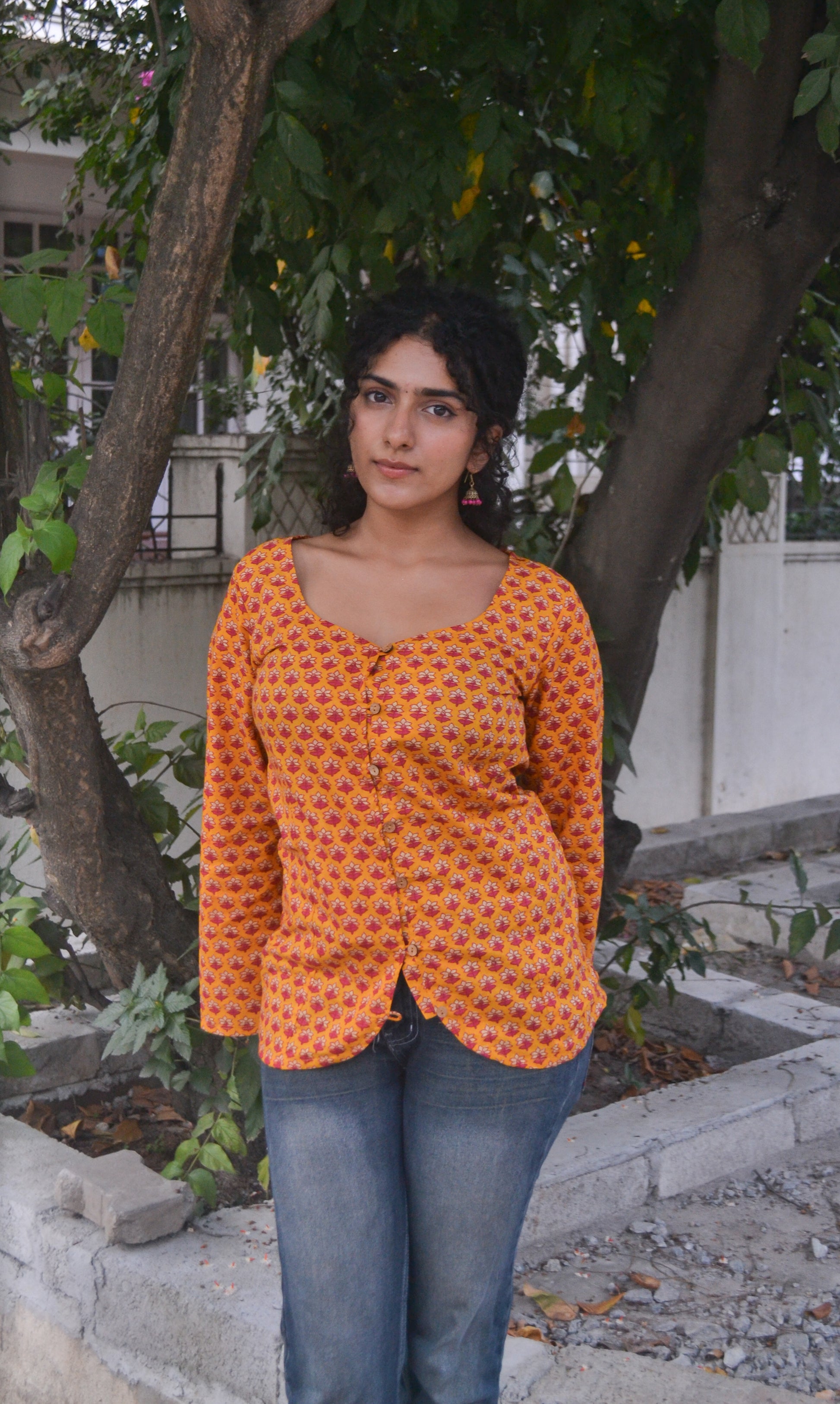 The Shagun Kurti brings a warm, festive glow to your wardrobe with its deep mustard base and intricate all-over geometric print in rich red. This full-sleeved tunic features a stylish button-down front and a flattering neckline, perfect for celebrations or daily wear.